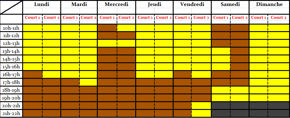 Cases marrons: Creneaux indisponible (Ecole de tennis)